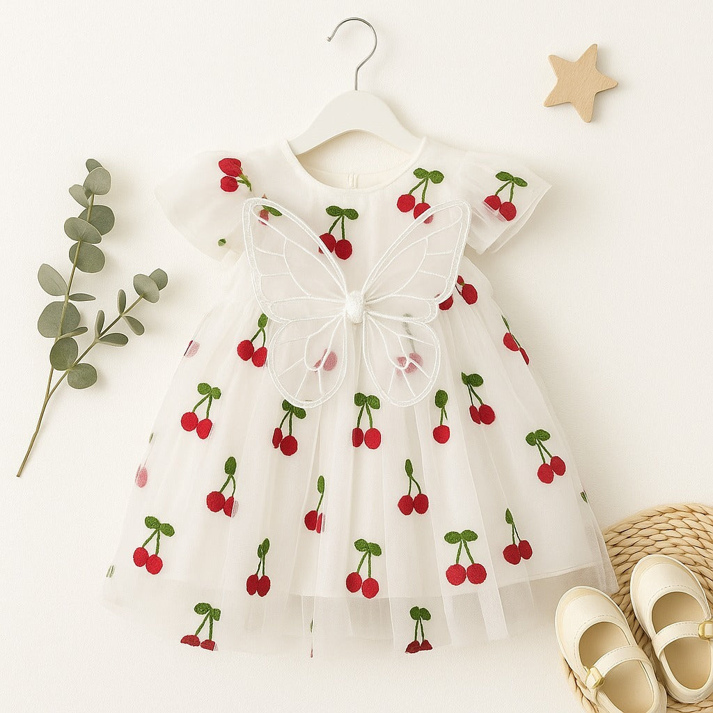 Charming Cherry Embroidered Baby Dress with Butterfly Accent