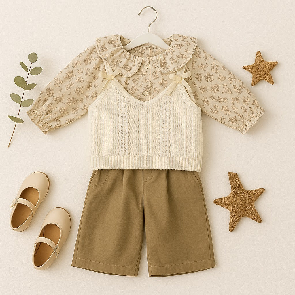 Material Type: Cotton blend blouse, knitted acrylic vest, and cotton shorts